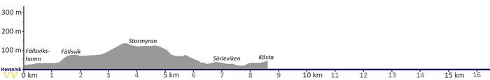 Vandringen börjar vid kapellet i Fällsvikshamn och följer vägen till Fällsvik, som har varit bebott av torpare och fiskare sedan 1500-talet. Där finns ett minimuseum. I norra delen av Fällsvik viker leden in på en sandig körväg. I backen upp mot Stormyran finns ett rastbord och Världsarvsledens Vänners geologiska information om vittringsgruset av Ulvödiabas. Därifrån går leden genom skogen till Sörleviken.