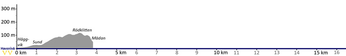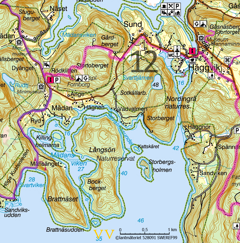 Följ asfaltsvägen genom den nedre delen av Häggvik i riktning mot Mädan. Här passeras Häggviks hamn som historiskt var traktens handelscentrum, men som idag har blivit en populär gästhamn för fritidsbåtar. Vid gästhamnen kan vandraren fylla på vattenflaskan.