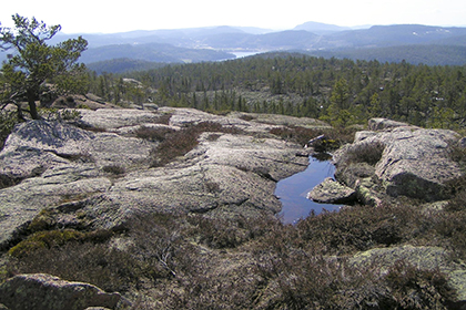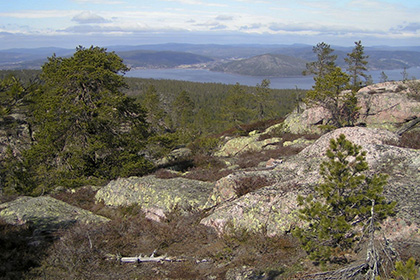Overall view from Örnsköldsvik to the north down to Härnösand. Several caves in northern hillside. Large shingle fields with distinct shoreline ridges on hillsides facing south and east, one located 261 m above sea level - the highest shingle field in the world.